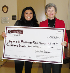 Charitable Foundation Trustee Lydia Kou presented a $2,000 check to Myllicent Hamilton, board director of the Westwind 4-H Handicapped Riding Program, a 2011 grant recipient, at this morning's Palo Alto District tour meeting.