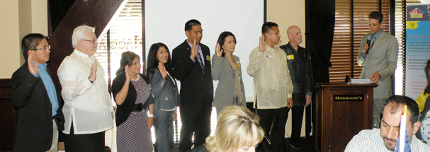 SILVAR Region 9 Chair Jeff Bell (far right) administers the oath of office to FAREPA's 2012 officers and board directors (left to right) Treasurer Jerry Quintos, Directors Richard Miller, Fe Casem, Evelyn Greenleaf and Marlo Ibon, Vice President Barbara Kuang, FAREPA President Richard Martinez, Immediate Past President Paul Stewart.